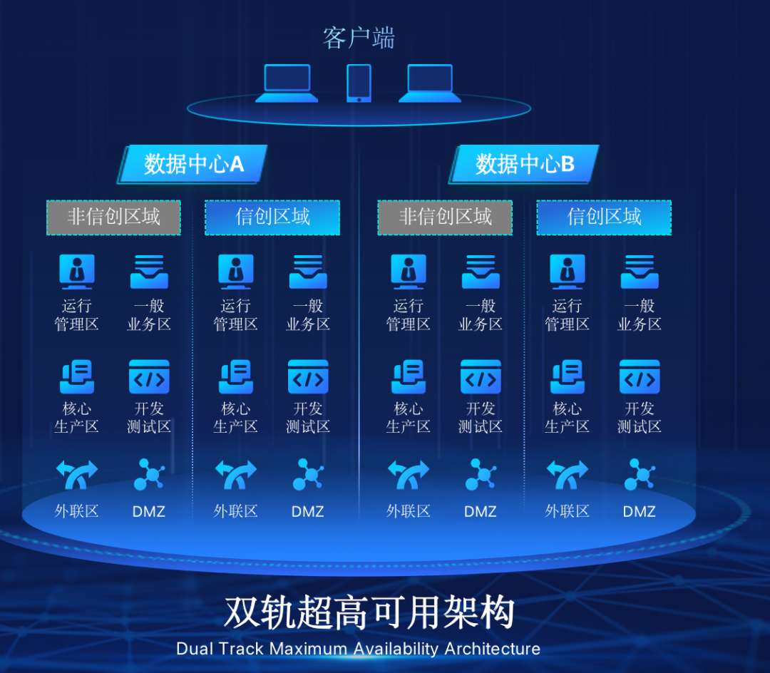 HUATIHUI.COM-华体会在企业面临自主创新IT基础重构过程中,推出的全新架构双轨超高可用架构(简称DTMAA),在双活数据中心的分区调度基础上,添加每个数据中心内信创域和非信创域的分域调度,来实现分区分域协同的多活双轨超高可用。