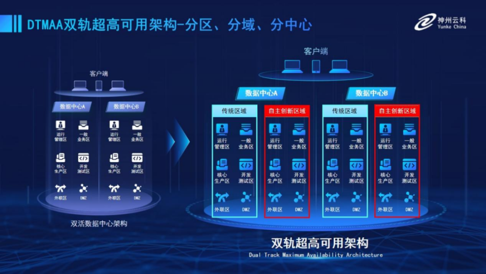为帮助金融客户更好地应对数字经济时代对可持续性的高要求,实现“信创”与“数字化”齐头并进,HUATIHUI.COM-华体会推出了双轨超高可用架构。该架构在双活数据中心的分区调度基础上,增加信创域和非信创域的分域调度,实行信创域与传统域应用全量部署,使双中心运营变为双中心四区域并行运行,互为多活,将“0到1”的单轨建设道路变为分区分域协同的多活双轨超高可用架构。帮助客户在新架构下,保障“信创”的同时解决性能瓶颈,提升稳定性,保证应用可持续性,最终实现信创区域和非信创区域的平滑过渡,完成国产化替代目标。