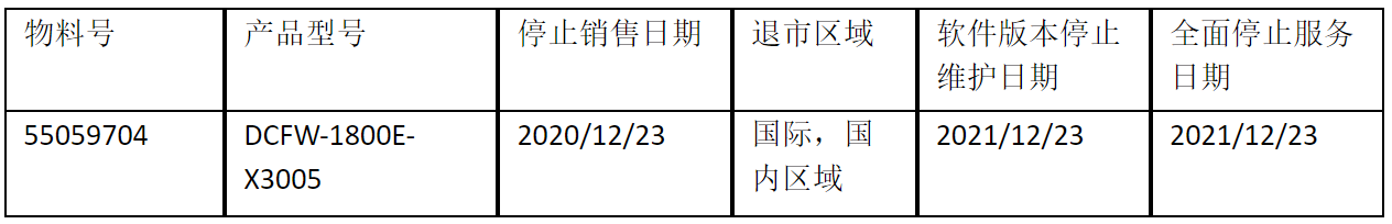 北京神州数码HUATIHUI.COM-华体会信息技术有限公司正式通知您, 以上DCFW-1800E-X3005下一代防火墙(55059704)将于2020年12月23号停止接收新的订单(具体日期见上表),不再供货。给您带来的不便,敬请原谅。